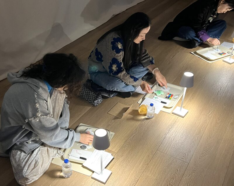 体验从身体觉察开始。参与者在引导下回忆童年与近期生命中的片段,但重点并不在于叙述故事本身,而是观察这些记忆在身体中唤起了什么感受。随后,参与者觉察自然浮现的颜色,并以水彩进行非具象的表达。这一过程帮助大脑从惯常的语言与认知处理模式,转入更整合的感知与情绪连接状态。