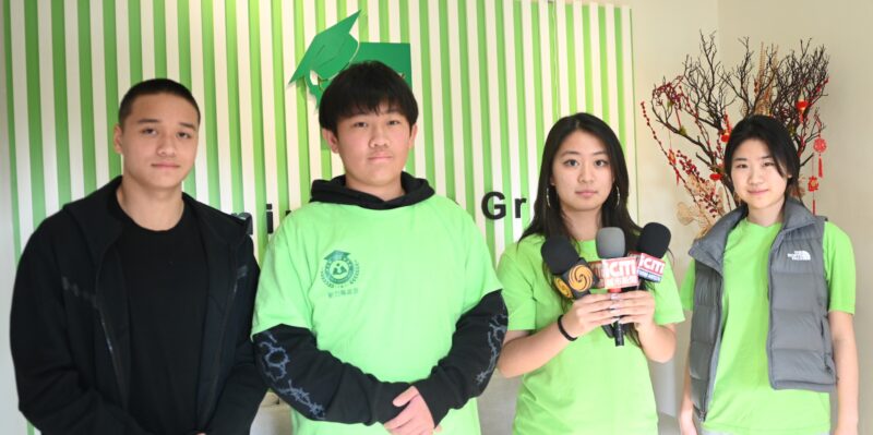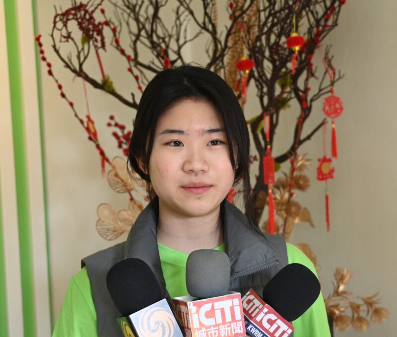 学生 Zoe Huyang(右2)等接受各大媒体记者访问