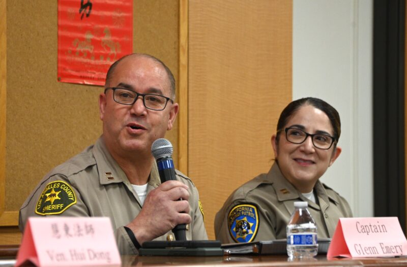 洛杉矶工业市警察局分局长G1enn Emery(左)讲话