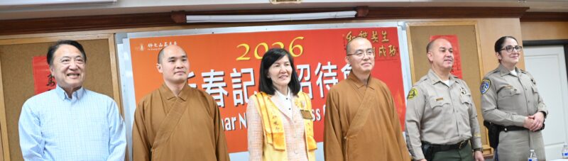 城市新闻2月 4 日哈仙达岗报导,佛光山西来寺召开新春新闻新闻发布会,西来寺住持慧东法师、慧澄法师、国际佛光会洛杉矶协会会长蔡月琴、洛杉矶工业市警察局分局长G1enn Emery、加州公路巡警圣塔菲泉分局长Melissa Hammond、华兴保险董事长张国兴、营销经理郑筱岚(Tracy Cheng)、西来寺媒体召集人倪永苓等出席支持