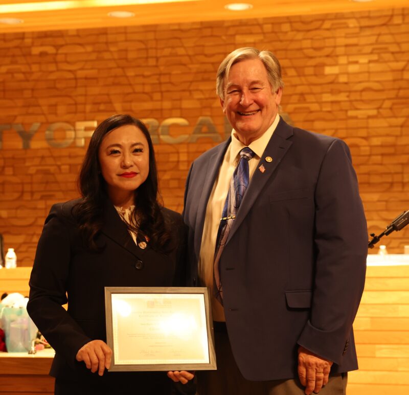 前加州众议员伍国庆代表国会议员赵美心向王爱琳市长颁发贺状