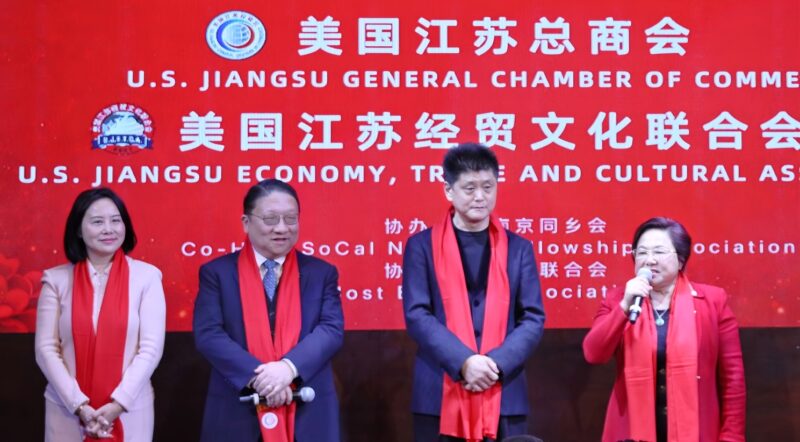 中国驻洛杉矶总领馆文化参赞王太钰、美国国会议员赵美心、核桃市副市长伍立伦、圣盖博市市议员丁言愉、美国江苏总商会、江苏经贸文化联合会会长徐晓峰、美国江苏总商会、江苏经贸文化联合会永远名誉会长蔡成华、美国江苏总商会、江苏经贸文化联合会荣誉会长郭岚、执行会长张琪祥和张恕生、秘书长王毅、美国华人社团联合会主席张勇、美国华人社团大联盟主席林淦花、美国鹰龙传媒董事长、中美电影节主席苏彦韬、美国加州企业家协会会长陈慧碧、美国北京联合会荣誉会长李红律师、美国北京联合会会长李相如律师、美国南京同乡会会长洪飞等先后致辞,向大家拜年,送上马年的祝福。