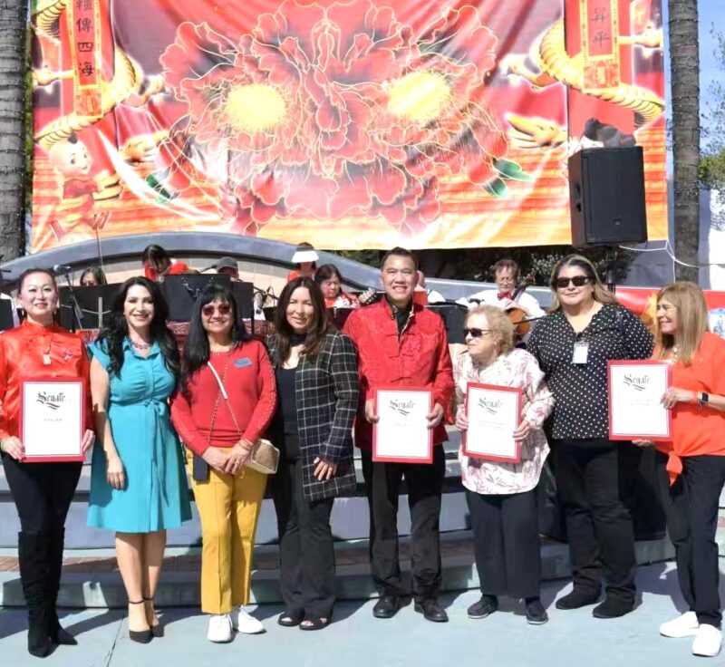 波莫纳市议员 Debra Martin、Victor Preciado、Nora Garcia、Elizabeth Ontiveros-Cole、Lorriane Canales向庆典筹备会主席王清伟(Eddie)、执行主席莫洁仪(Linda Mok)等颁发证书