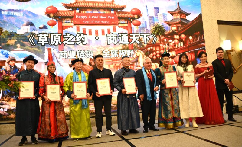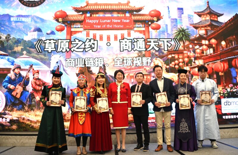 美国内蒙古总商会会长于忠霞首先致词,她表示,美国内蒙古总商会在这里共同庆祝新年活动,同时也是商会成立16周年的年会。文化界、企业界以及民选官员一同参加庆祝活动。特别是好莱坞著名导演、制片人、奥斯卡奖获得者,与我们一起体验内蒙古文化,把中华文化与好莱坞对接。我们这个平台除了文化贸易交流外,更让大家了解中国文化,也让好莱坞走进中国、走进内蒙古。