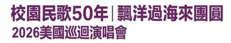 2026年4月,这场承载半世代记忆、具有指标性意义的音乐重聚,将跨越太平洋,正式登上美国洛杉矶舞台。「校园民歌50年,漂洋过海来团圆。2026 美国巡回演唱会」,将以国际级制作规格、完整且极具代表性的演出阵容,为观众呈现一场全长三小时的音乐盛会。