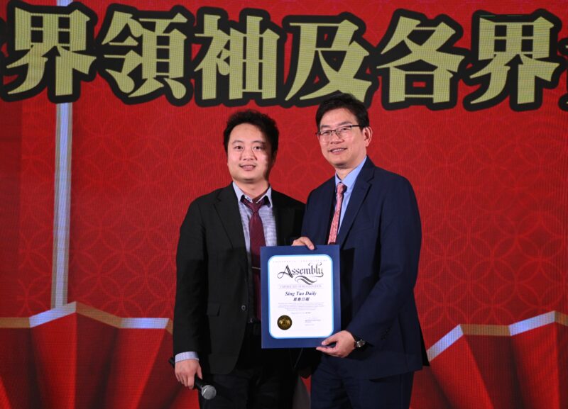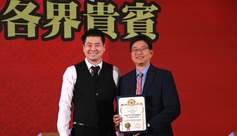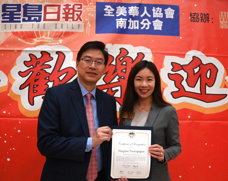 加州众议员方树强代表賀文博(Jayson He)向星岛日报美西版社长兼总编辑梁建锋(右)颁发贺状