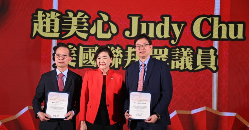 美国国会议员赵美心向星岛日报美西版社长兼总编辑梁建锋(右)、全美华人协会南加分会会长何畅源(左)颁发贺状