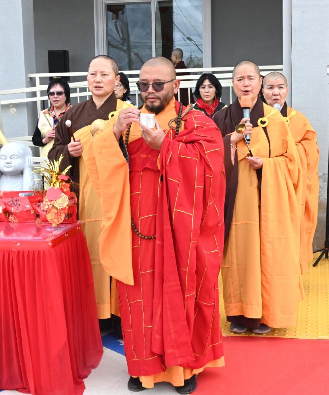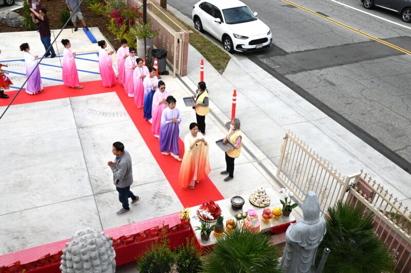恭请蒙特利公园市市长杨安立、副市长吴绍荣、前市长林达坚致上祝福与勉励,市长们的慈悲与祝福,愿善语成为今日的吉祥缘起。随之,进行十供养献供。十种供养,象征以身、口、意三业,将最清净的心奉献于三宝。愿今日所供,皆成无量功德,普利一切众生。愿此供食,令一切众生离饥渴苦,得安稳乐。」八、宝供养:愿众生珍惜善缘,具足福德资粮。