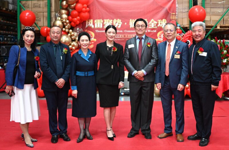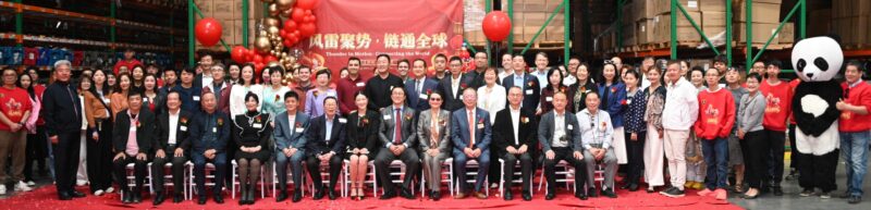 风雷集团董事长冯烨、总裁王明明,美国华人社团联合会主席张勇、美国华人联合总会会长、美国克勤会计师事务所合伙人杨逸凡,Carnegie Towers International, Inc. 董事总经理、美中商务顾问邓兆祥(Henry Tang),美国联邦众议员 Ken Calvert 办公室代表Jett Benavidez、河滨县第2选区县政委员代表Edward、加州众议员Castillo办公室代表Zachary Gohl、圣盖博市市议员丁言愉、美国华人联合总会企业家联盟负责人邵闻、美国华人联合总会荣誉会长熊文胜、尼克松总统图书馆文化旅游文化教育部负责人张简(Jane Zhang)、尼克松博物馆代表Hayden为风雷集团洛杉矶仓储中心正式启用剪彩。