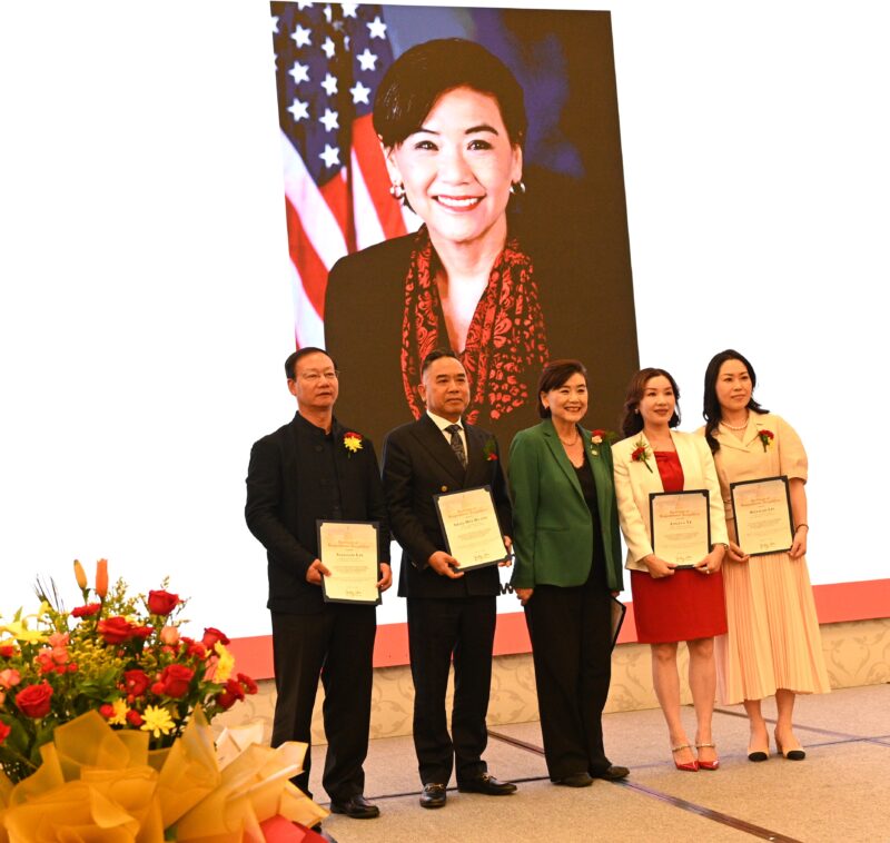 右起:美国内蒙古总商会常务执行会长于丽娜、加州众议员方树强、会长于忠霞、常务副会长马骏、圣盖博市议员吴程远