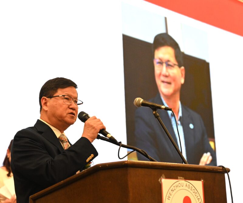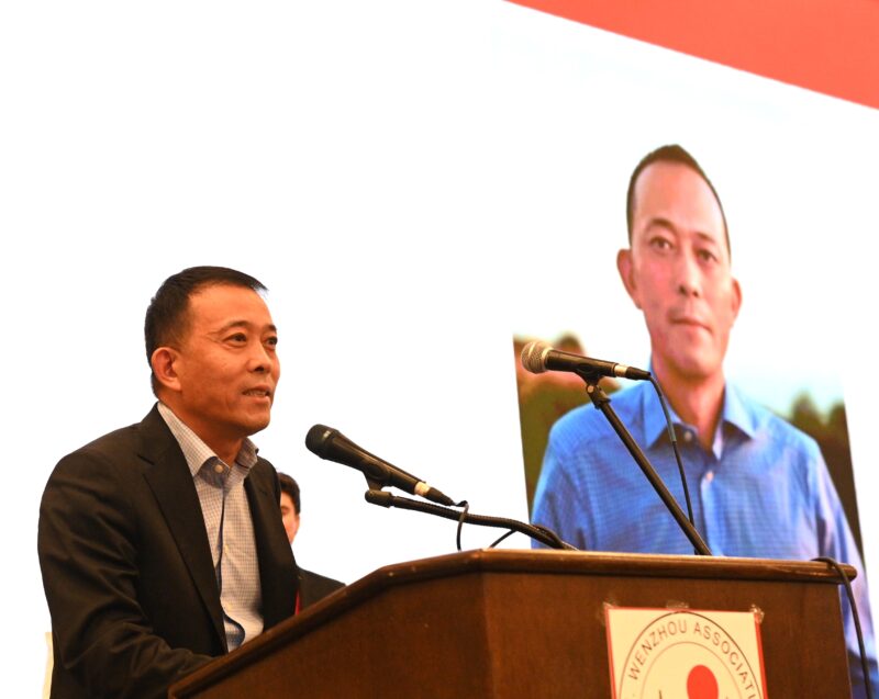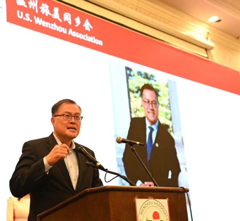 温州旅美同乡会荣誉会长王俭美致词表示,回顾170多年以前,华人就到加州挖金矿,修铁路。踩着他们的足迹,我们来到美国创业,温州人就是生力军之一。总结温州华侨华人的影响力,有以下几点。第一、商业经营。会员企业遍布各行各业,皮鞋、箱包、灯火机、保健品、海外仓等,尤其是大中华超市、林宁国的电池、倪立东的电器等,展现温州人敢为人先、务实拼搏的精神。