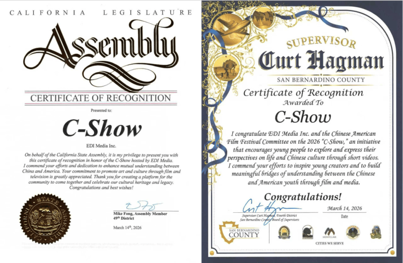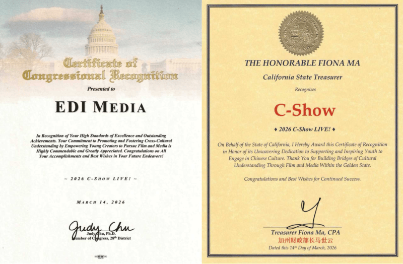 春意盎然的3月,一场跨越太平洋的青春对话在美国洛杉矶精彩上演。由美国鹰龙传媒公司与中美电影节|中美电视节组委会联合主办的“2026 C-Show LIVE!”活动于3月14日在中美电影节|中美电视节总部鹰龙文化中心隆重举行。众多美国民选官员、好莱坞影视名流与中美青少年创作者齐聚一堂,共同见证了2026年“秀中国”(C-Show)第二季的荣耀时刻。