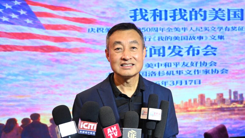 有奖征文组委会总策划、美中和平友好协会主席鹿强接受各大媒体记者访问