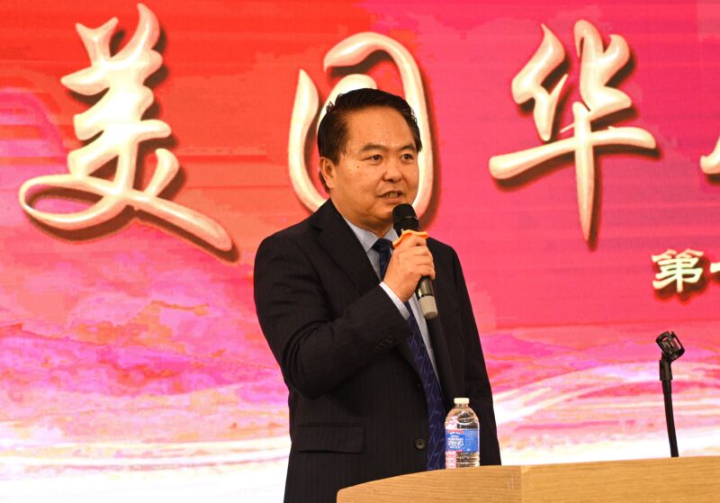 美国华人社团联合会荣誉主席宣国军(右2)致辞