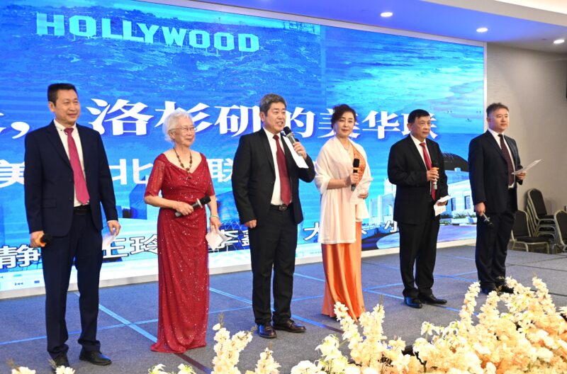 美国华人社团联合会荣誉主席宣国军(右4)、赵洪民(右3)、熊文胜(左1)、叶国安(右2)等致辞