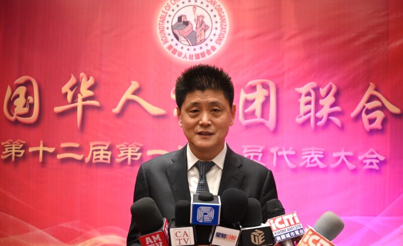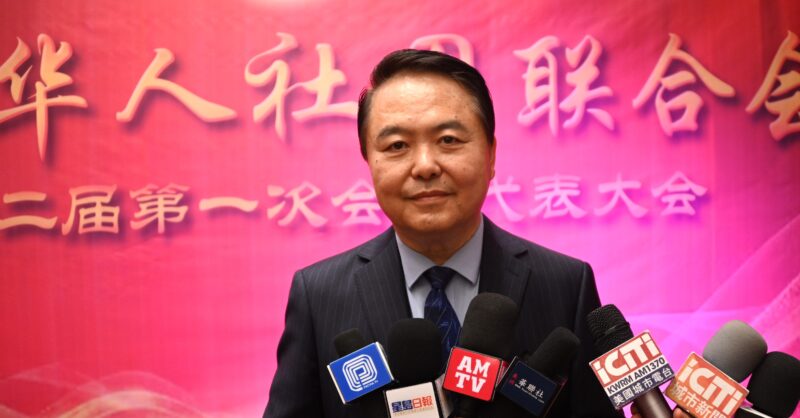 获得高票连任的美国华人社团联合会主席张勇接受各大媒体记者访问