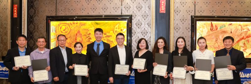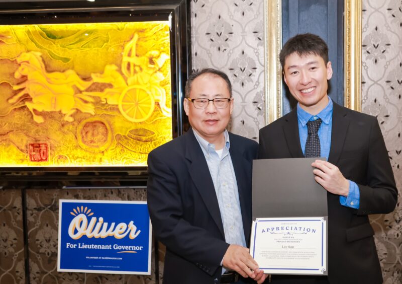 加州副州长候选人马沫克(Oliver Ma)向参加慈善晚宴支持者颁发証书