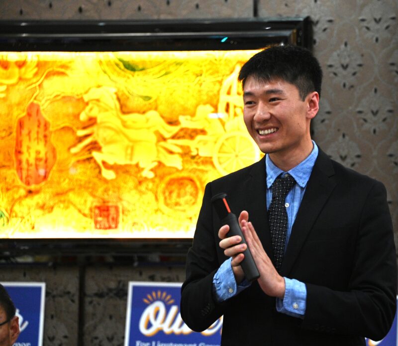 马沫克(Oliver Ma)竞选加州副州长慈善晚宴上,他还与支持者积极互动,现场回答支持者提问,气氛融合。