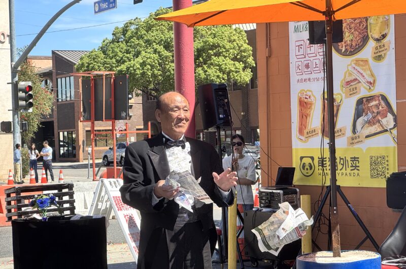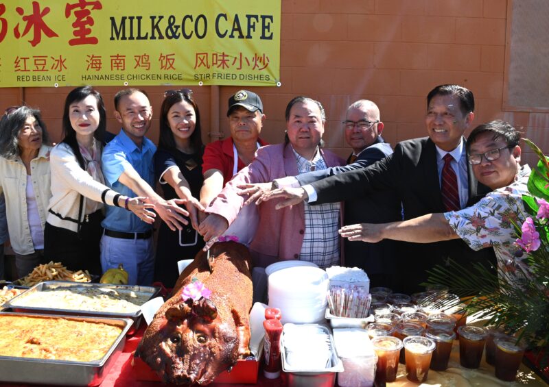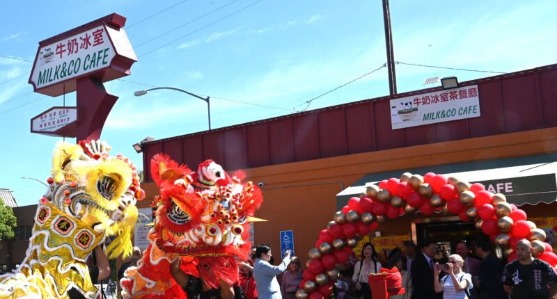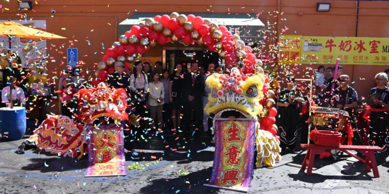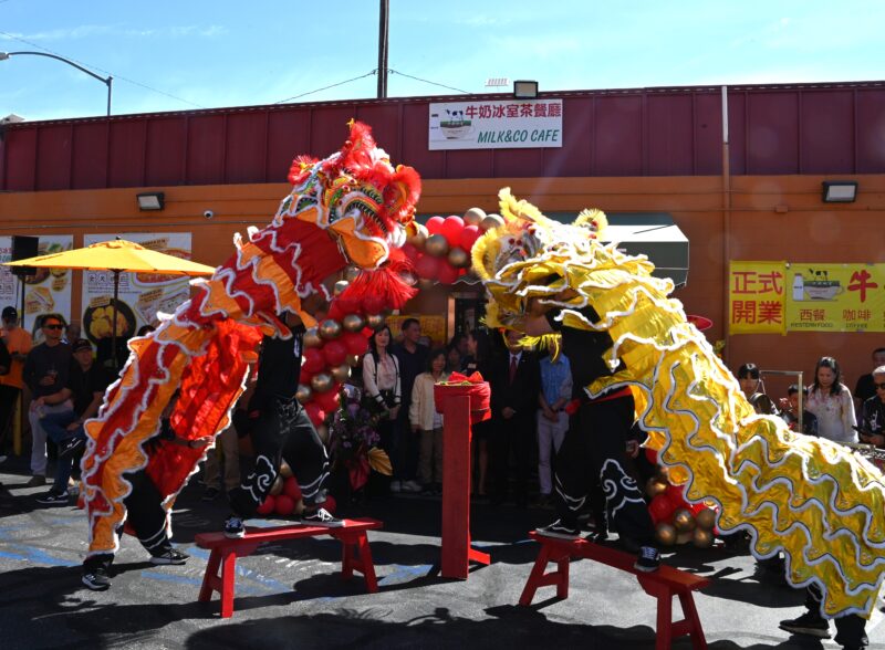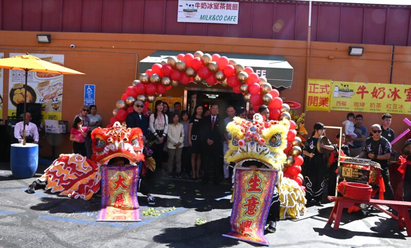 城市新闻3 月29日蒙特利公园市报道,位于蒙特利公园市 Garvey 大道上的牛奶冰室·港式茶餐厅(Milk & Co Cafe) 在锣鼓喧天与金狮起舞的热闹氛围中正式开幕。现场彩炮齐放、花篮成排,吸引众多民众驻足围观,场面喜庆热闹,为这家全新的港式茶餐厅揭开序幕。好莱坞魔术师周泽友现场作精彩表演,庆贺牛奶冰室开张。