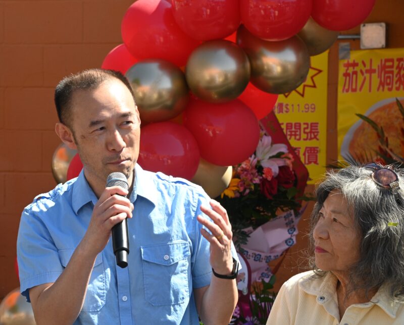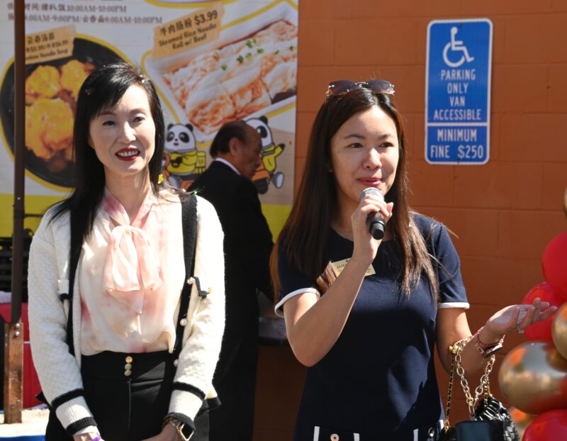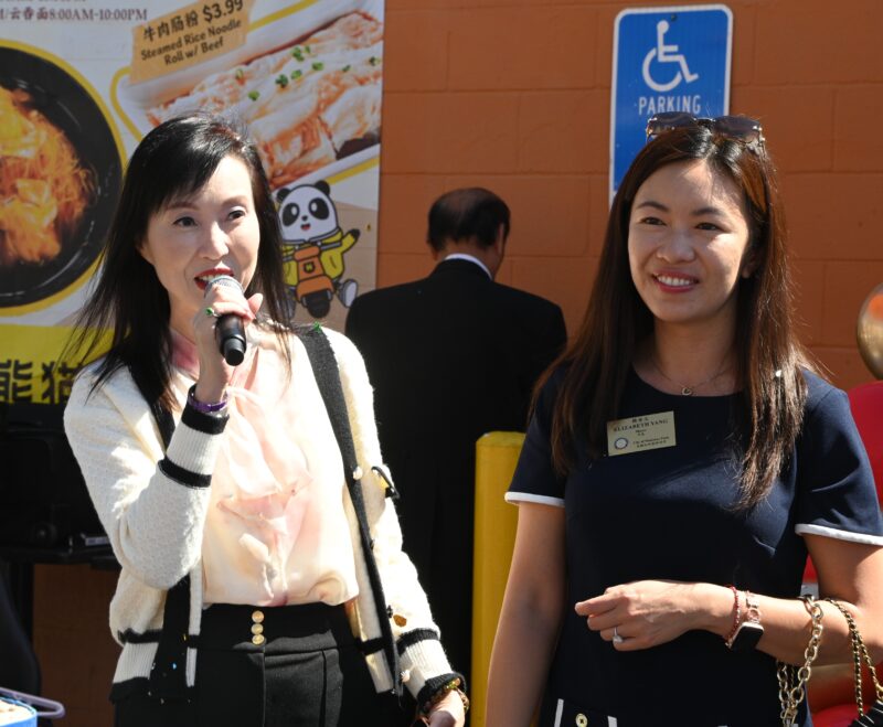 蒙特利公园市副市长吴绍荣致词、好莱坞演员胡玲(右)