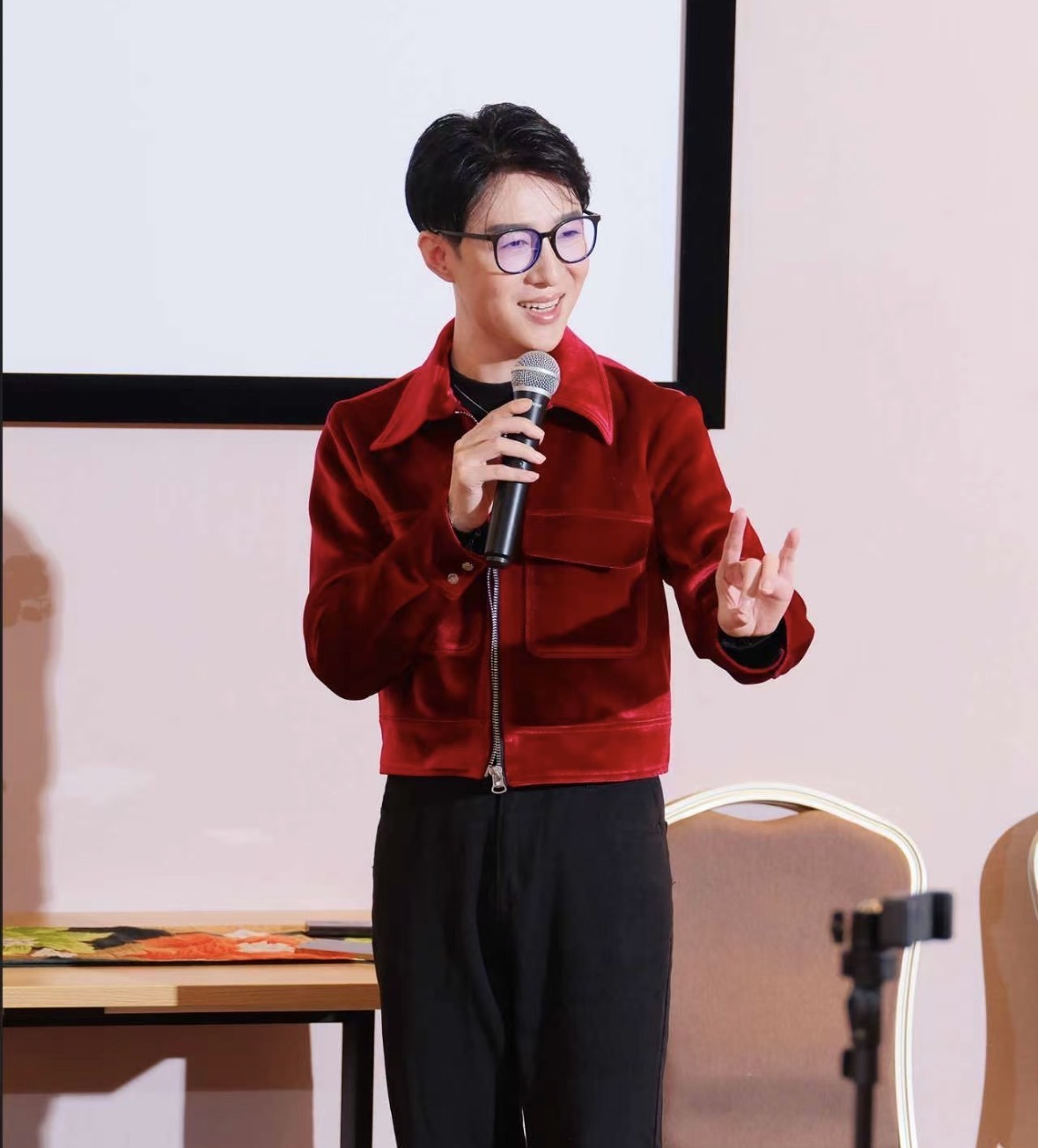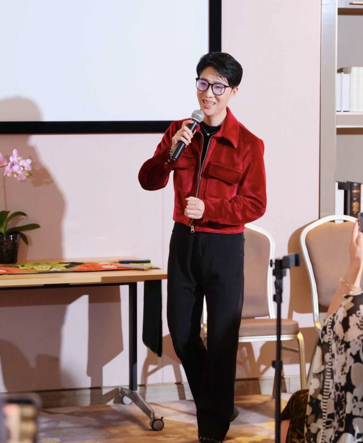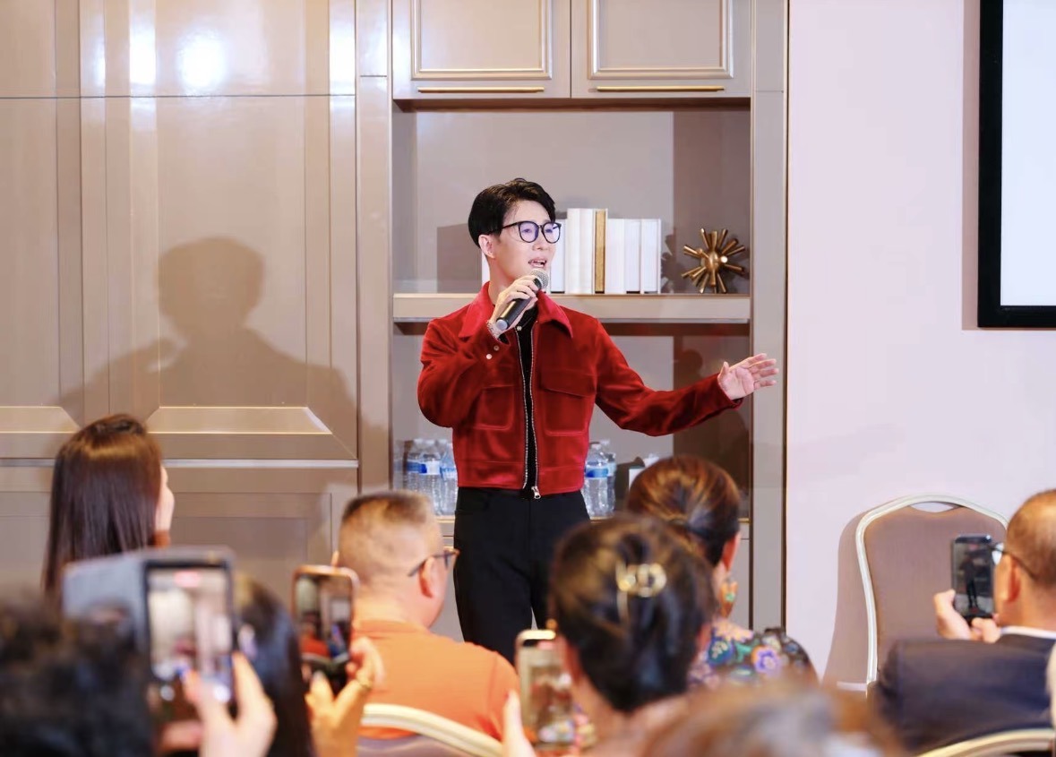 在分享环节,董飞以梅派**“平正安和”**的美学内核为引,向观众娓娓道来从艺的心路历程。他细致拆解了梅派唱腔的婉转圆润与身段的行云流水,并亲身示范了“兰花指”等戏曲基本功。针对中西文化碰撞的现状,董飞深入探讨了乾旦艺术在当代的传承与创新,展现了传统艺术扎根青年、走向国际的时代生命力。