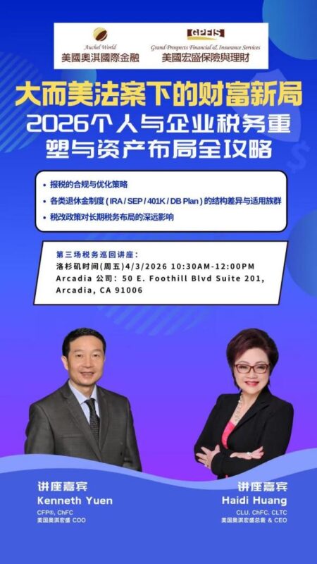 本次Arcadia 站讲座由美国奥淇宏盛总裁兼CEO黄海蒂女士(CLU, ChFC, CLTC)与美国奥淇宏盛COO Kenneth Yuen先生(CFP®, ChFC)联合主讲,从税务重塑到资产布局双线展开,不仅回应了报税季下客户最关心的现实问题,也进一步帮助听众建立起更清晰、更具前瞻性的个人与企业财富规划思路。