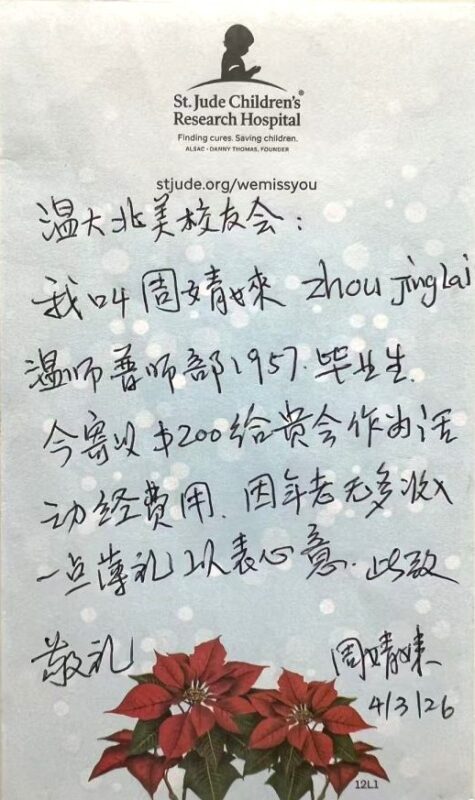 57年毕业的校友周婧妹,大概是最为年长的北美校友,她从纽约寄支票支持温大北美校友会,令人感动。她在附信说,“我叫周婧姊zhou jinglai,温师普师部1957毕业生,今寄以200美元给贵会作为活动经费用。因年老无多收入一点薄礼以表心意。此致敬礼”