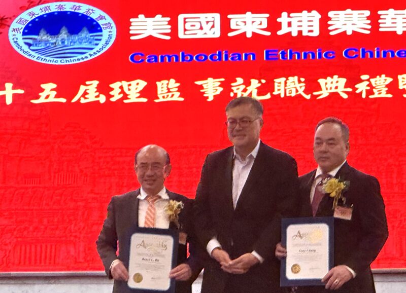 柬埔寨代表 Vanessa Pang向美国柬埔寨华裔会馆会长张键伟(左)、监事长杨利武(右)颁发贺状