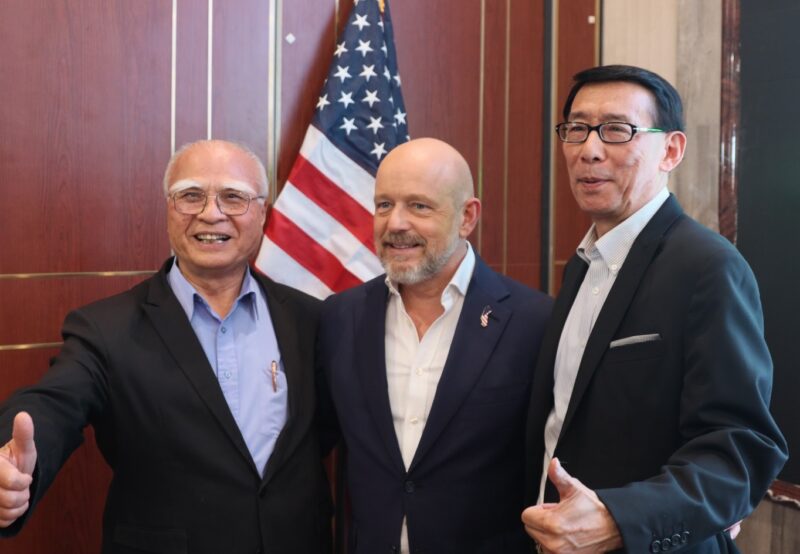 右起:社区代表丁伟豪、加州州长候选人希尔顿(Steve Hilton)、卢顺兴