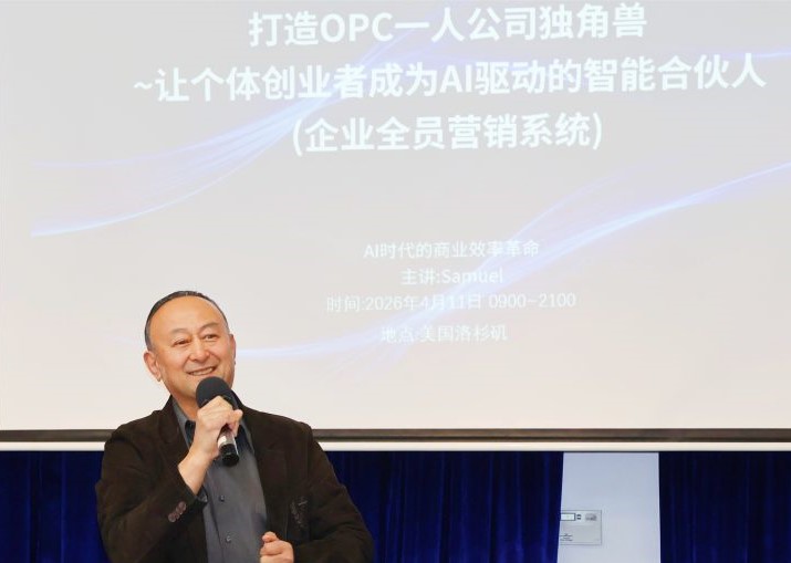 城市新闻4 月11日圣盖博报道,在人工智能持续重塑商业格局的背景下,一场以“AI+OPC打造一人独角兽”为主题的创新活动在洛杉矶阿尔罕伯拉市(Alhambra)举行。活动围绕AI技术在销售体系与个体创业领域的应用展开,美国南加州华人社团大联盟主席林淦花、荣誉主席魏海鹰、奉商美国总会主席朱俊英、华兴保险总裁张国兴等众多企业家及行业从业者参加。