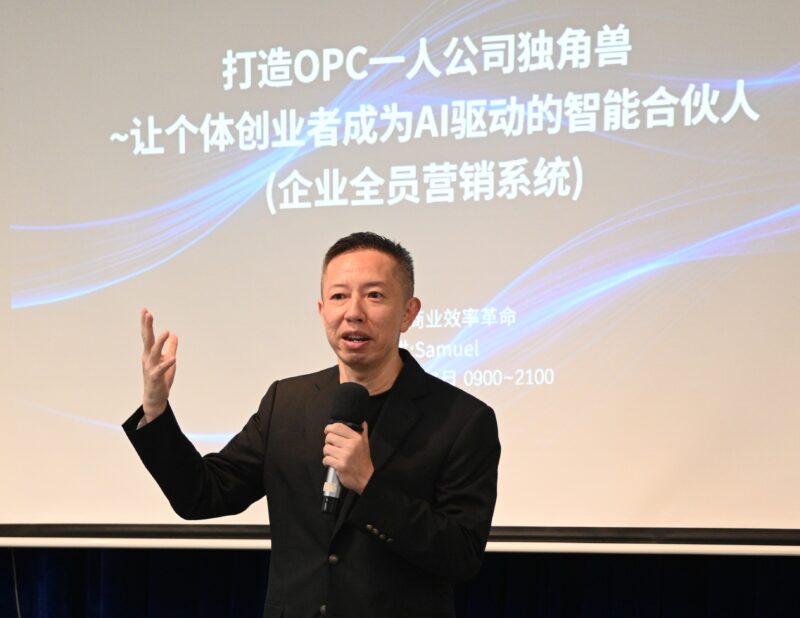 在主题演讲中,洪豪泽(Samuel Hung)从全球商业趋势出发,系统阐述了AI与商业模式融合的底层逻辑,并结合其在教育、科技、金融及咨询领域的实践经验,深入解析“AI+OPC个人独角兽创业战略”的发展路径。他表示:“未来的竞争力,不仅取决于企业规模,更在于是否具备以AI驱动的系统化能力。”