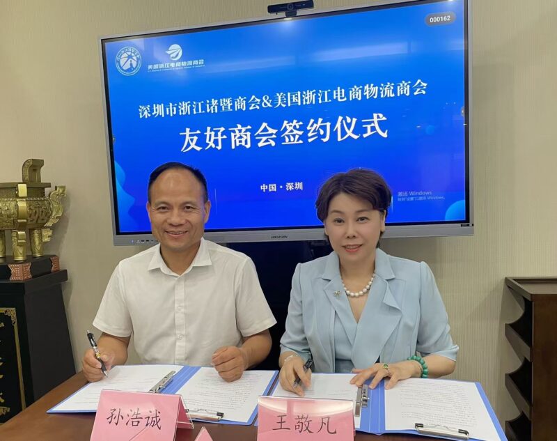 美国浙江电商物流商会会长孙浩诚(左)与深圳市浙江诸暨商会会长王敬凡(右)共同签署协议