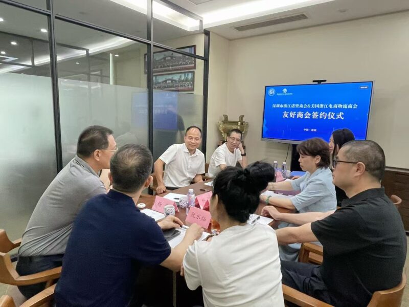 城市新闻4 月 17 日洛杉矶报道,美国浙江电商物流商会与深圳市浙江诸暨商会签约友好商会在深圳市浙江诸暨商会会议厅举行,深圳市浙江诸暨商会会长王敬凡、美国浙江电商物流商会会长孙浩诚、深圳市浙江诸暨商会副会长蒋龄瑶、理事马旦宇、张宏炬、杨洁、副秘书长赵丽萍等出席签约仪式。