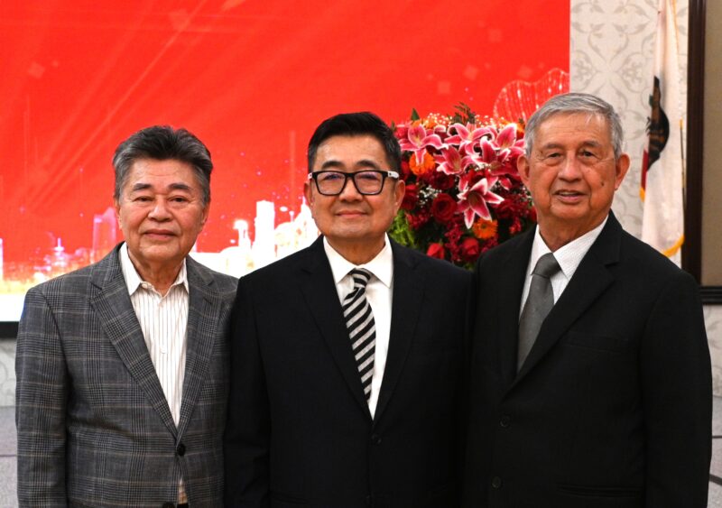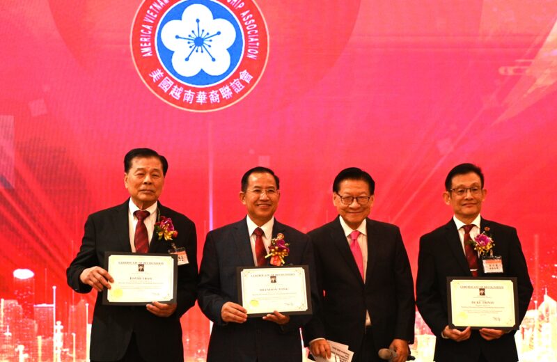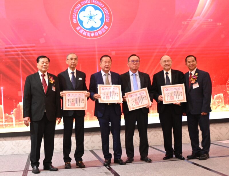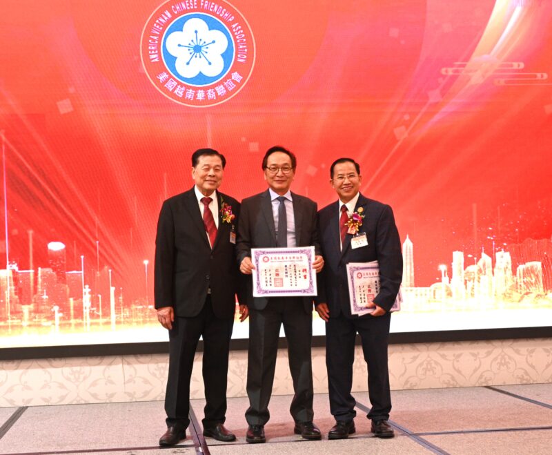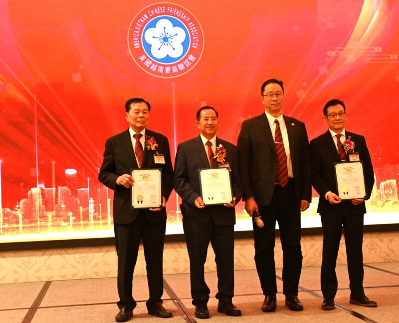 左起:世界越柬寮华人团体联合会荣誉主席李宏良、美国越南总商会会长马世骏、美国寮华联谊会荣誉会长林雄国