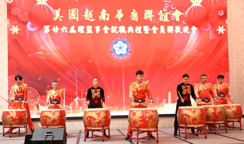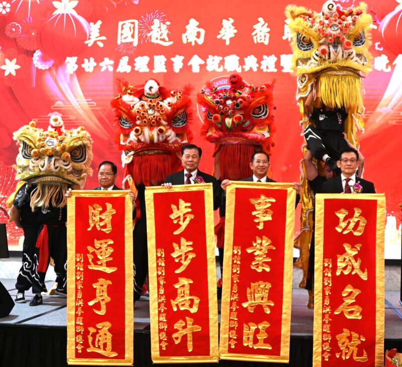 锣鼓声声,双狮齐舞,美国越南华裔联谊会盛大举行第廿六届理监事会就职典礼暨会员联欢晚会在热烈气氛中拉开序幕,美国越南华裔联谊会荣誉主席马志远上台主持交接印信,越华会第二十五届主席郑炜德把印章交给了第廿六届主席唐国强;在美国国会议员赵美心监誓下,美国越南华裔联谊会主席唐国强、监事长陈铭正率新一届理监事会正式就职。