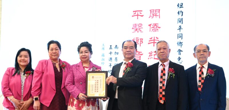 美国国会议员赵美心(左3)向南加开平同乡会主席罗淑珍(左1)、纽约开平同乡会主席邓学源(右2)、旅美开平同乡总会主席司徒永峰(右1)颁发贺状