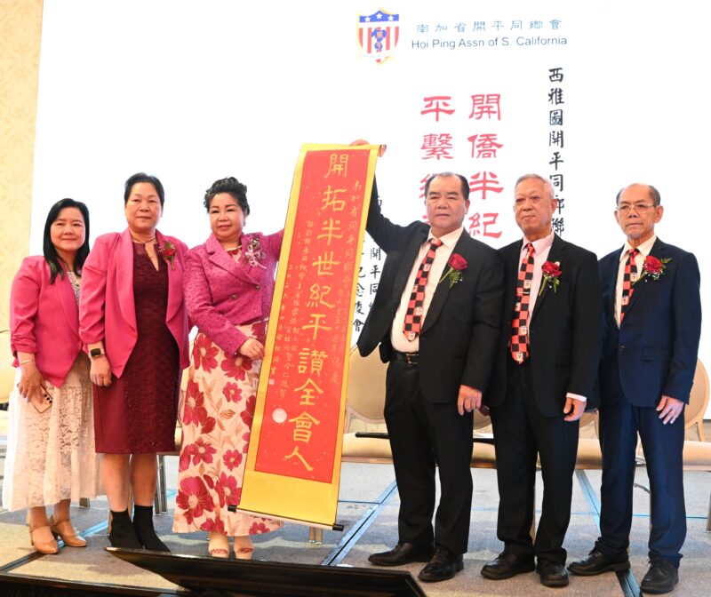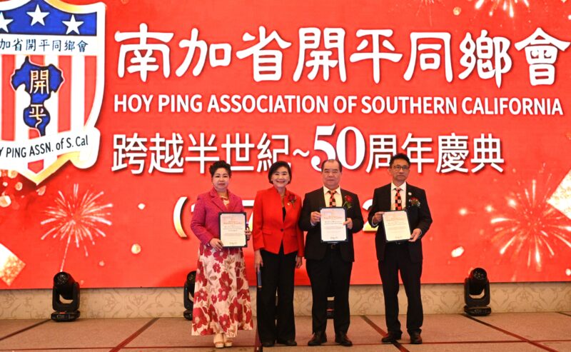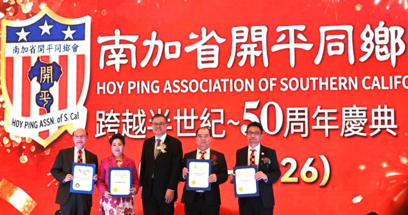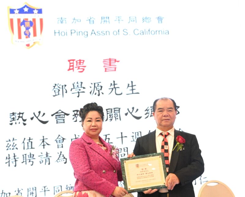同日下午5时,庆典移师圣盖博半岛希尔顿酒家举行。在晚宴开始前,大会迎来了多位主流政要亲临祝贺。美国联邦国会议员赵美心博士(Dr. Judy Chu)及加州众议员方树强(Mike Fong)现场颁发表扬奖状给南加州开平同乡会主席罗淑珍、纽约开平同乡会主席邓学源、旅美开平同乡总会主席司徒永峰以及西雅图开平同乡会主席等,肯定同乡会对促进社区和谐与传承中华文化的贡献。此外,罗淑珍主席也代表同乡会,正式向邓学源与潘强淋颁发聘书,敦请两位担任名誉顾问,持续为会务发展提供宝贵指导。