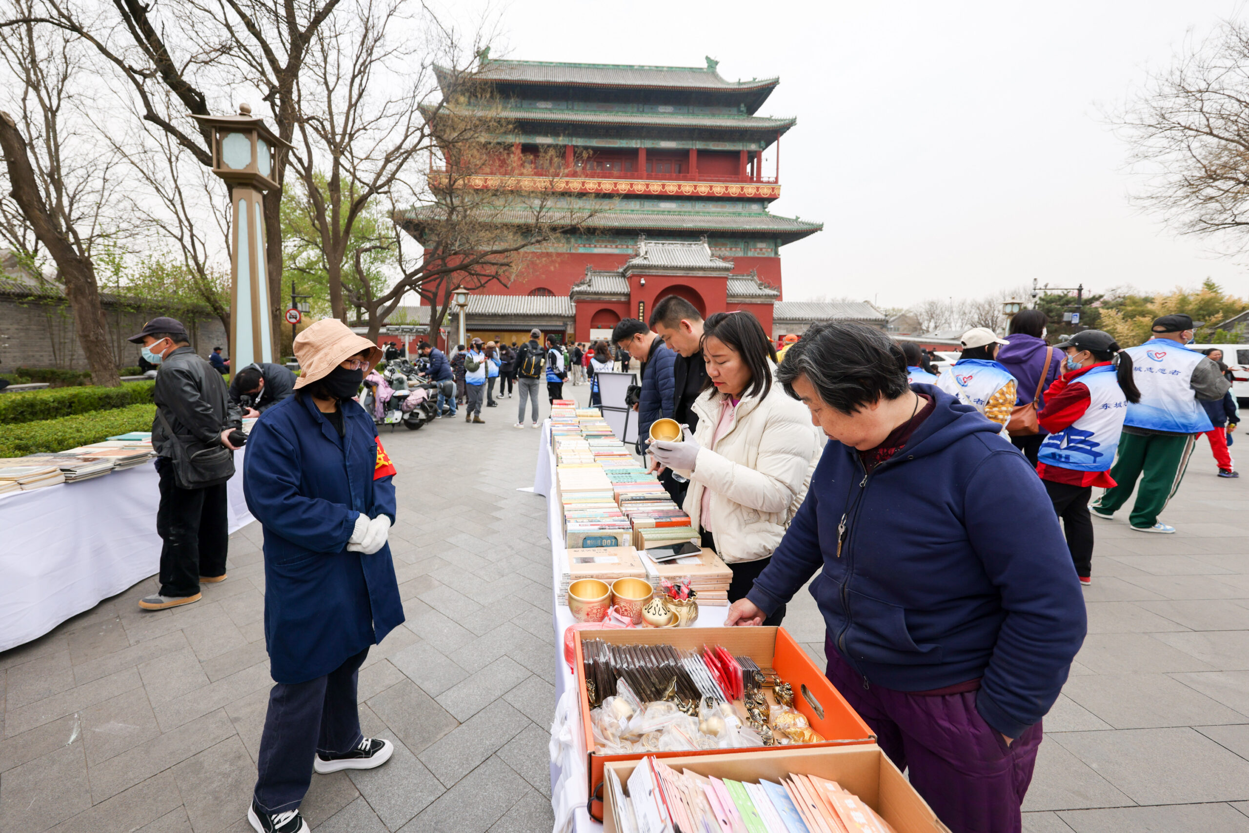 4月4日,市民在北京钟鼓楼广场淘旧书。当日,首届“旧书新知 钟鼓书韵”文化市集开市,市集为期三天,汇...