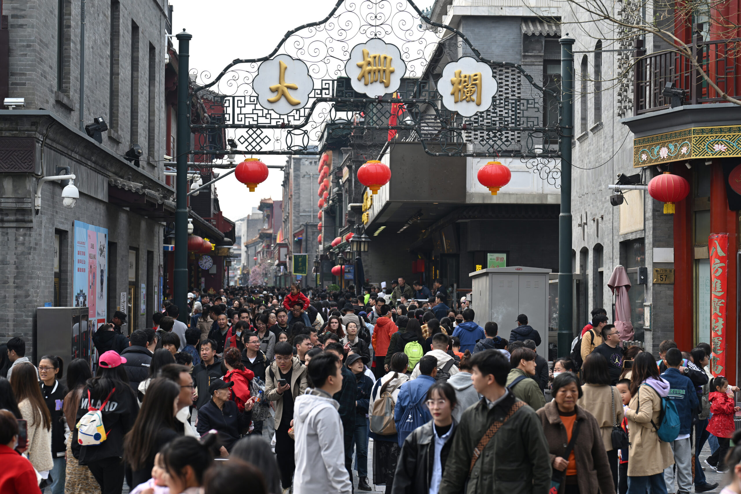 4月4日,游客在前门步行街游览。当日是清明假期第一天,北京前门步行街、故宫博物院、什刹海等旅游景区游...