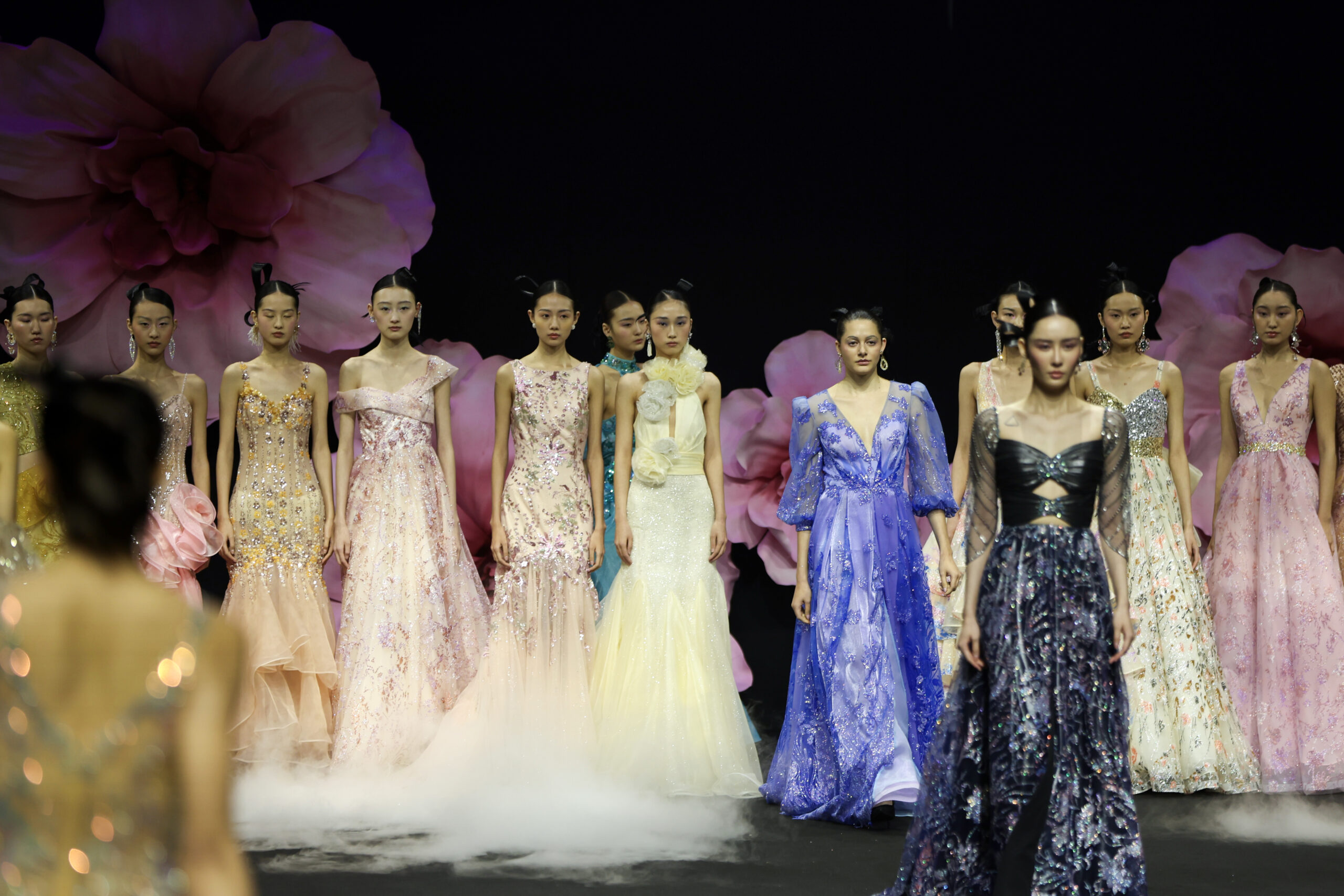 3月27日,2024秋冬中国国际时装周“芸想·关淑敏”主题时装秀在北京上演。图为模特展示时装。 未经...