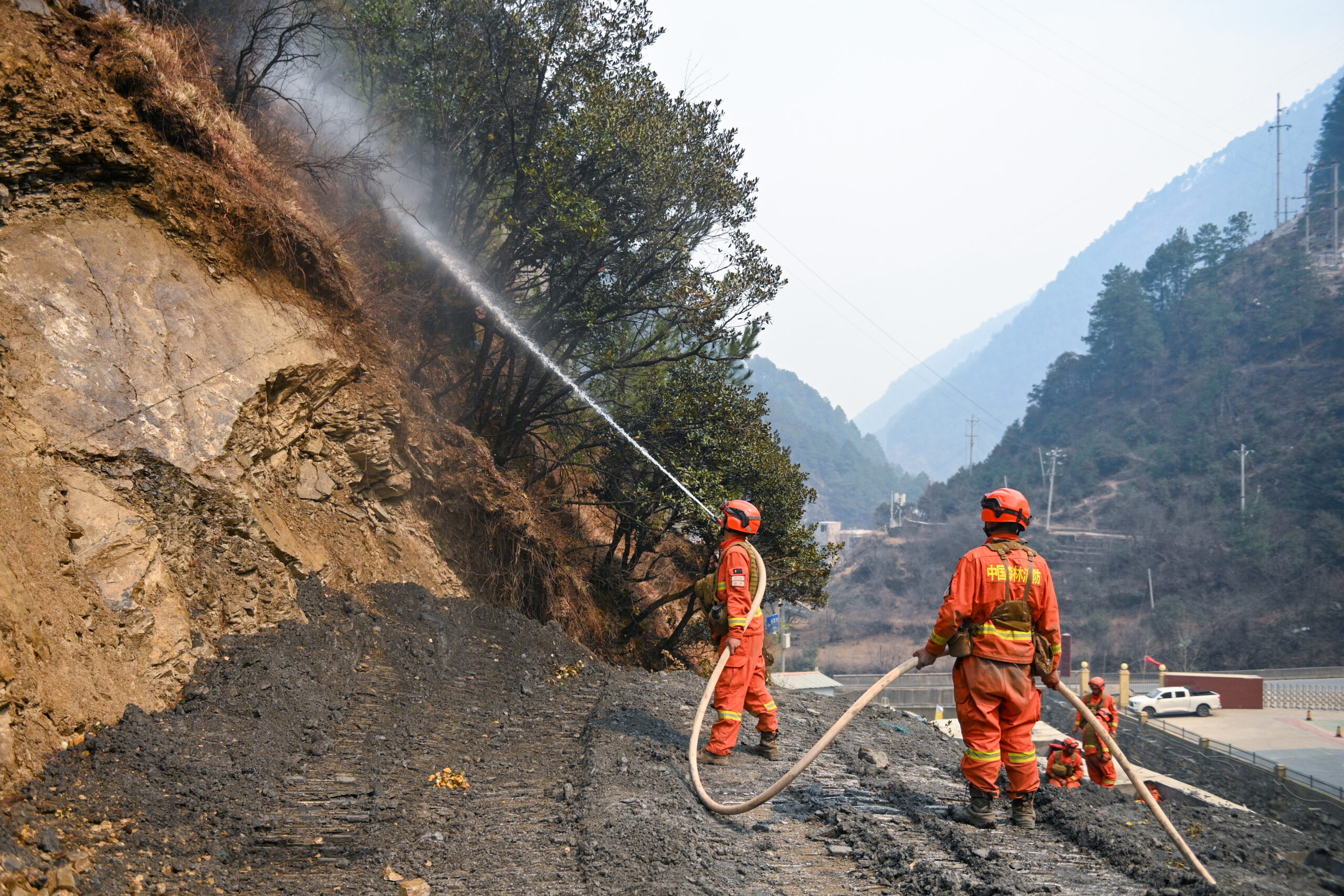 3月18日,四川雅江,3号火场南线凉山森林消防员对山崖边植被进行增湿作业,阻截山火下山。当日,经12...
