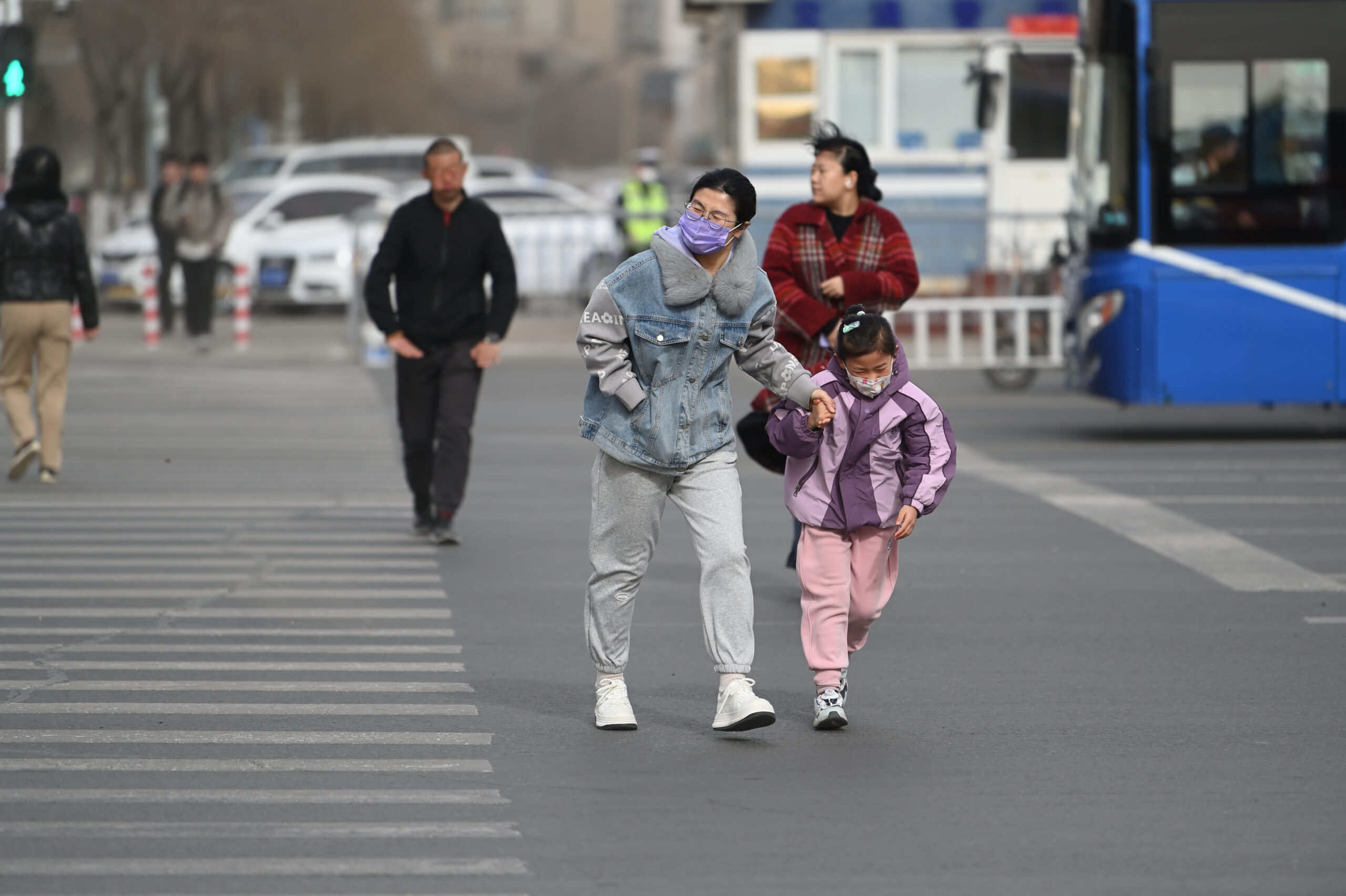 3月18日,内蒙古呼和浩特市,家长领着小朋友在大风中出行。当日,呼和浩特市迎来大风天气,当地气象部门...