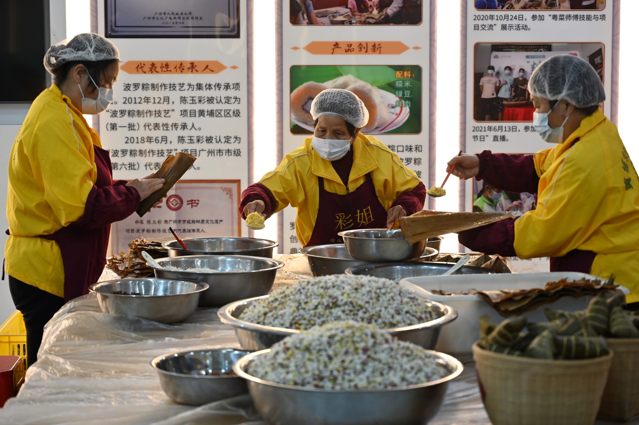 3月17日,广州市黄埔区穗东街道非遗传承工作室“彩姐波罗粽”的工作人员在制作“波罗粽”。“波罗粽”是...