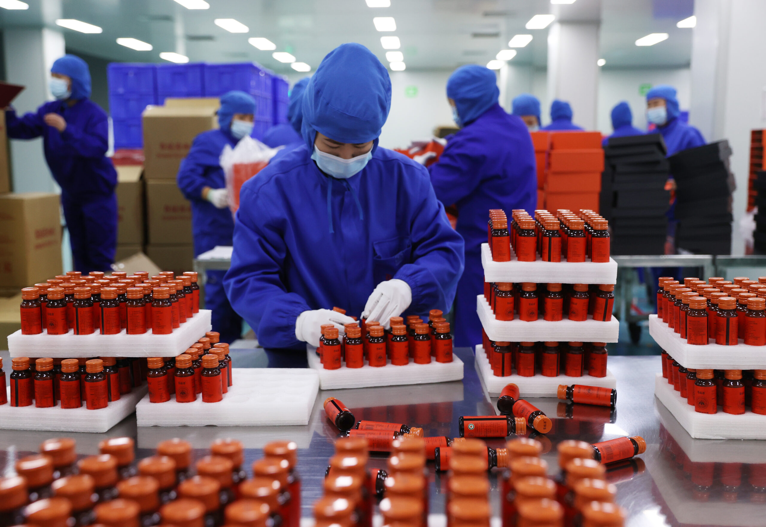 3月2日,宁夏银川,工作人员在一枸杞产品生产车间内赶制枸杞原浆订单。宁夏枸杞是中国国家地理标志产品,...