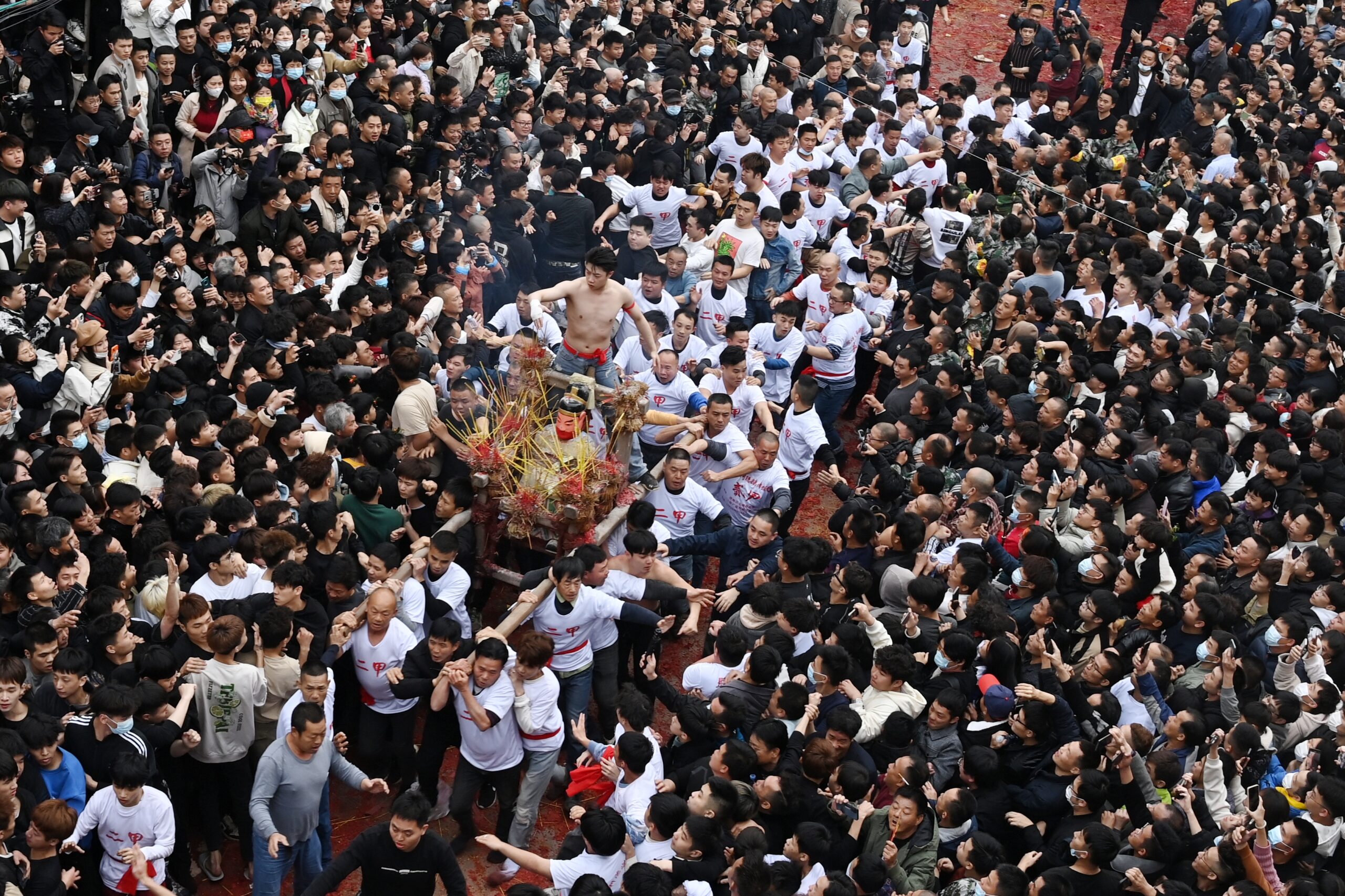 3月2日,农历正月廿二,广东汕头澄海盐灶举行拖神祈福民俗活动。村民们将神偶捆绑在神轿里,巡游至指定的...