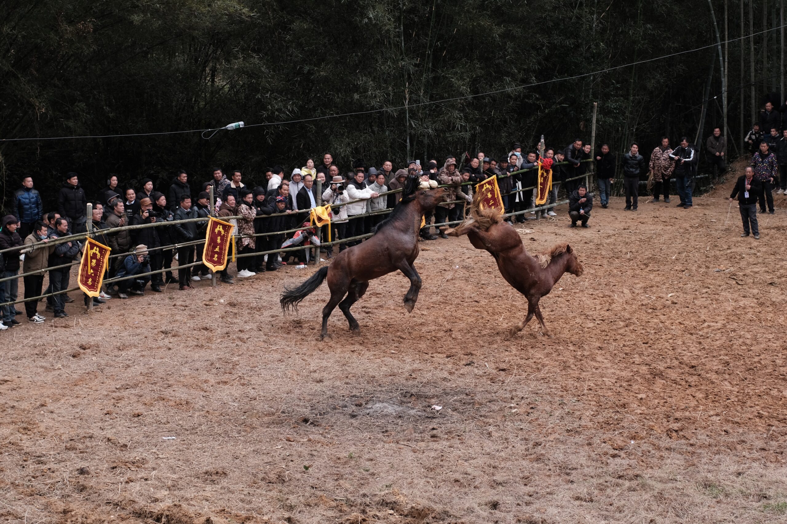 2月26日,广西柳州市融水苗族自治县安陲乡江门村,当地传统的芒篙坡会正在进行。在村中的斗马场中,烈马...