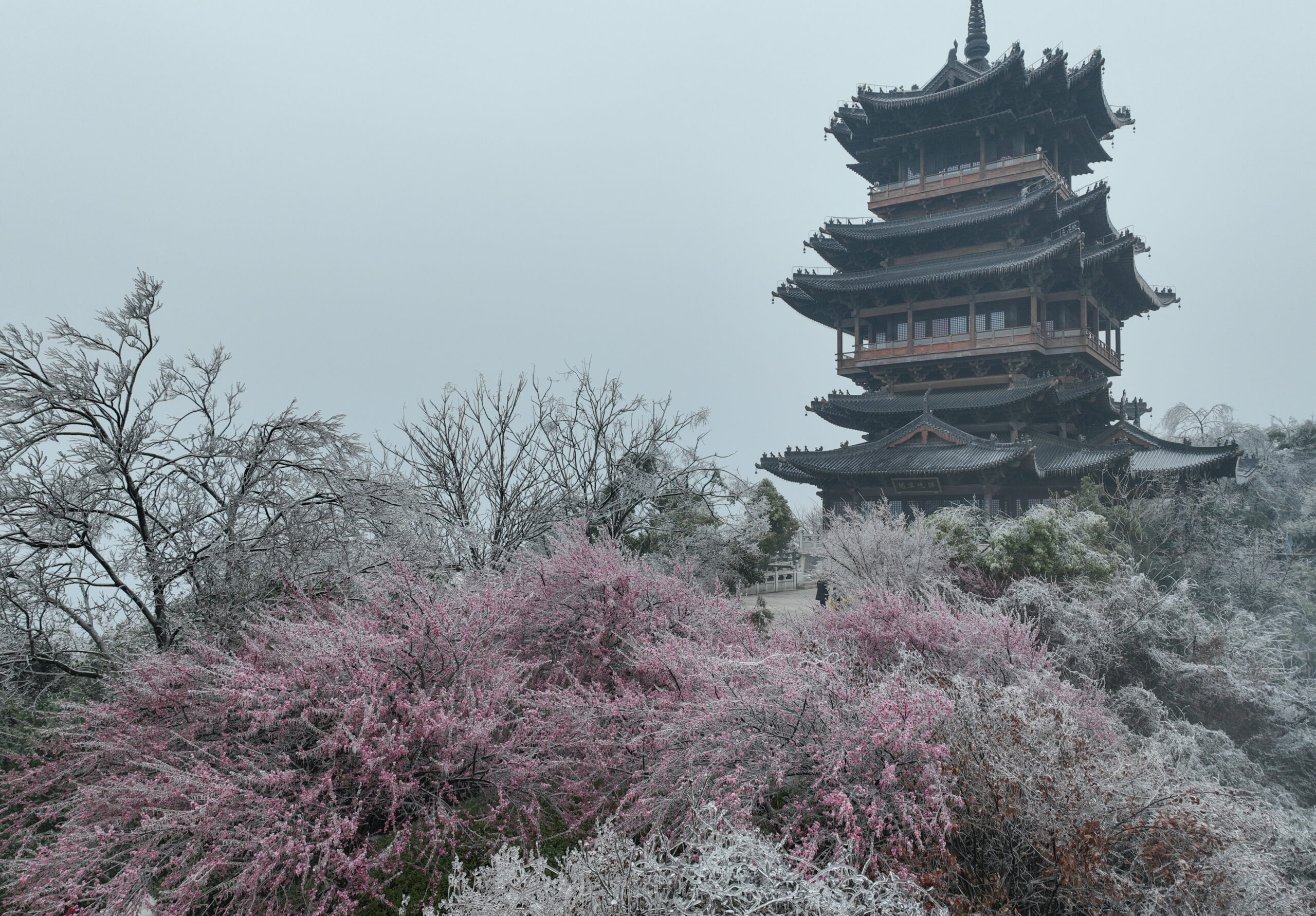 2月26日,杭州望宸阁前的梅花被“冰封”。近日,受降温降雨天气影响,浙江杭州多地山区出现了雨凇景观,...