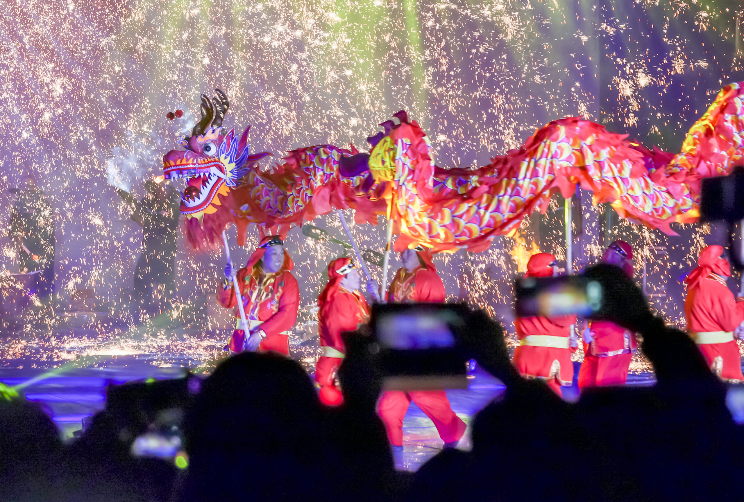 2月25日晚,北京世界公园内上演非遗打铁花,并配以灯光秀、歌舞和舞龙表演,吸引大量游客观看。 未经允...
