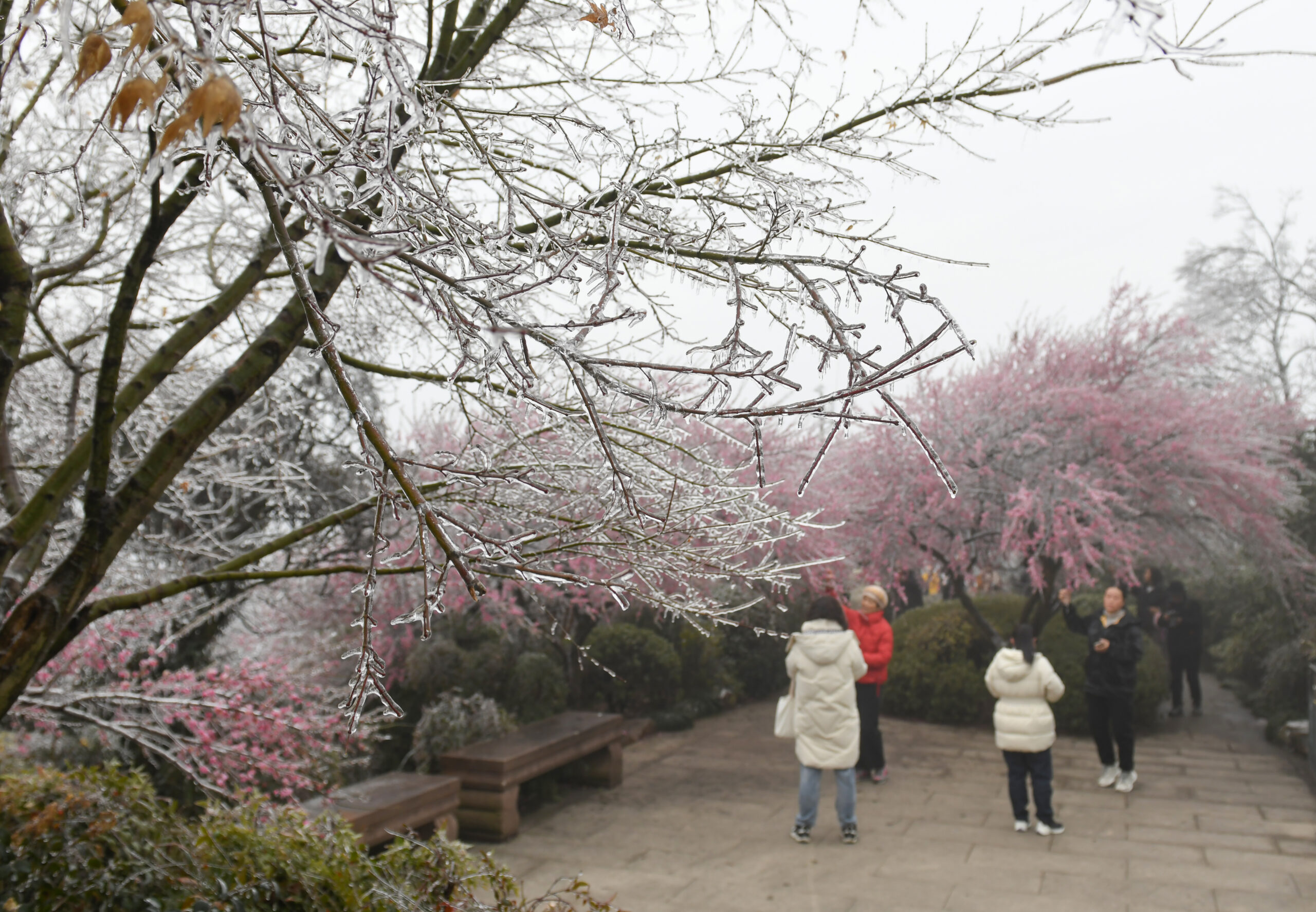 2月26日,游人观赏雨凇景观。近日,受降温降雨天气影响,浙江杭州多地山区出现了雨凇景观,花木被冰层包...