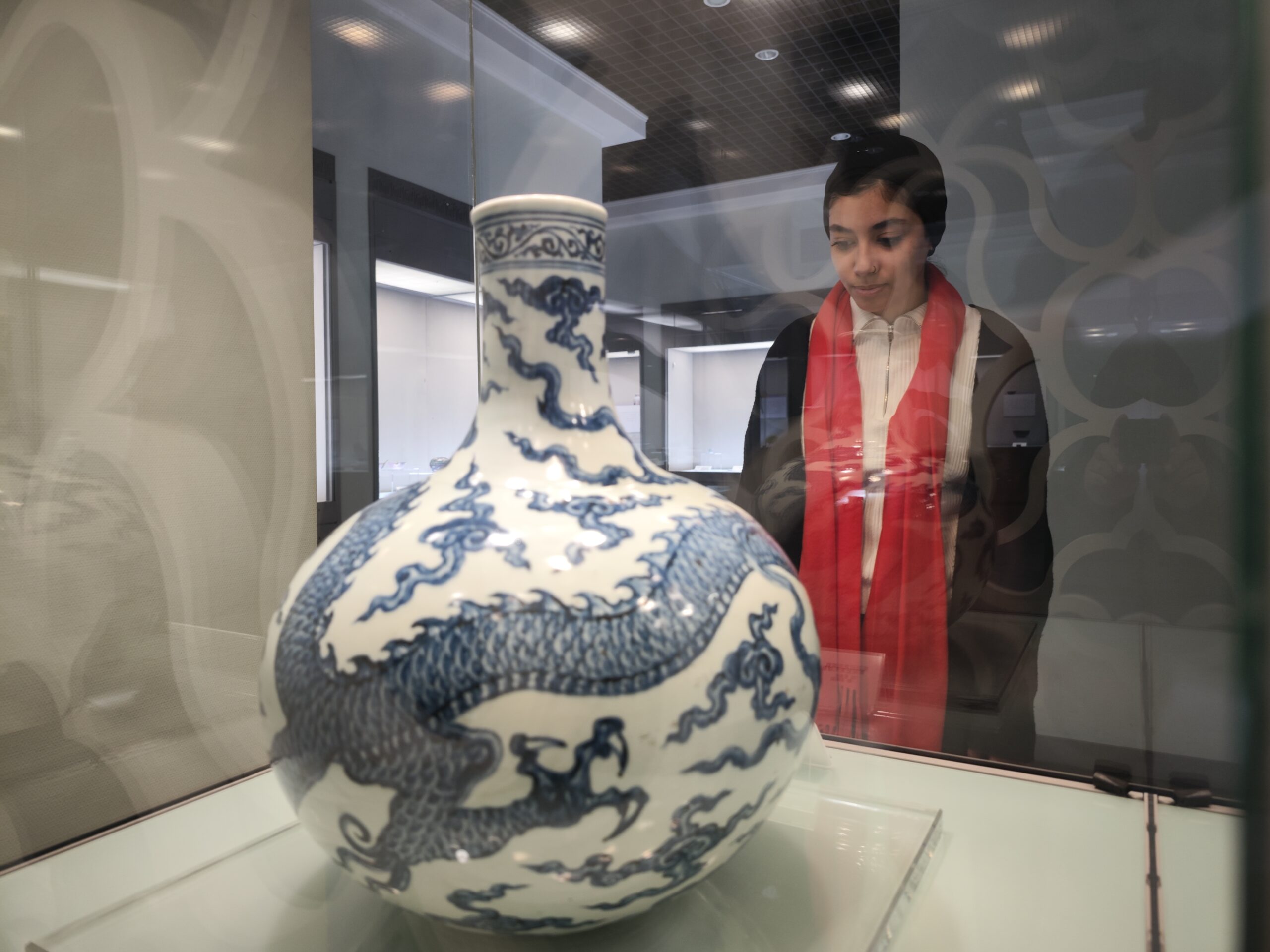 龙年春节,来自埃及的24岁天津外国语大学留学生哈拉在天津博物馆寻找与自己生肖相同的“龙”文物。图为哈...